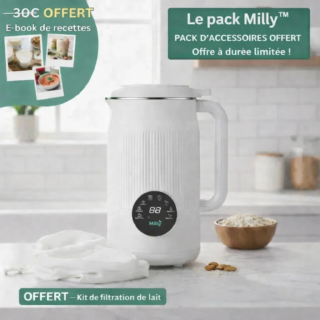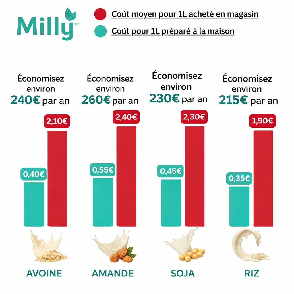 Le lait végétal en grande surface coûte en moyenne 2 à 4€ par brique, alors qu’il est composé en grande partie d’eau, de conservateurs et d’additifs. Avec Milly, vous préparez chez vous un lait frais et onctueux pour une fraction du prix. Une simple poignée de fruits secs et de l’eau suffisent pour créer une alternative plus saine, plus économique, et qui vous permet d’économiser semaine après semaine.