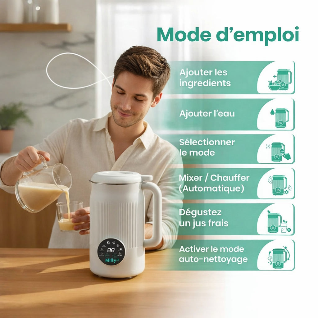 Stop aux boissons industrielles pleines d’additifs et de sucres cachés. Avec Milly™, préparez chez vous des boissons végétales fraîches, naturelles et saines, en quelques minutes — sans compromis sur le goût, la santé ou le budget.